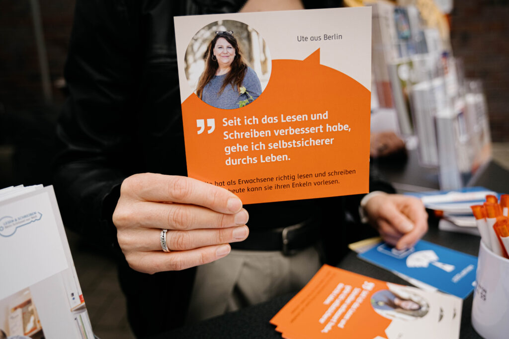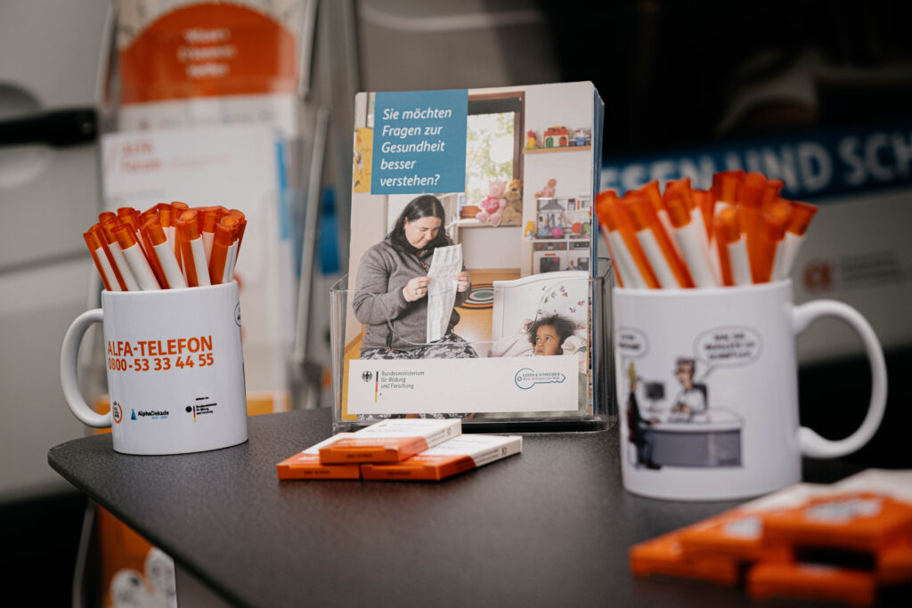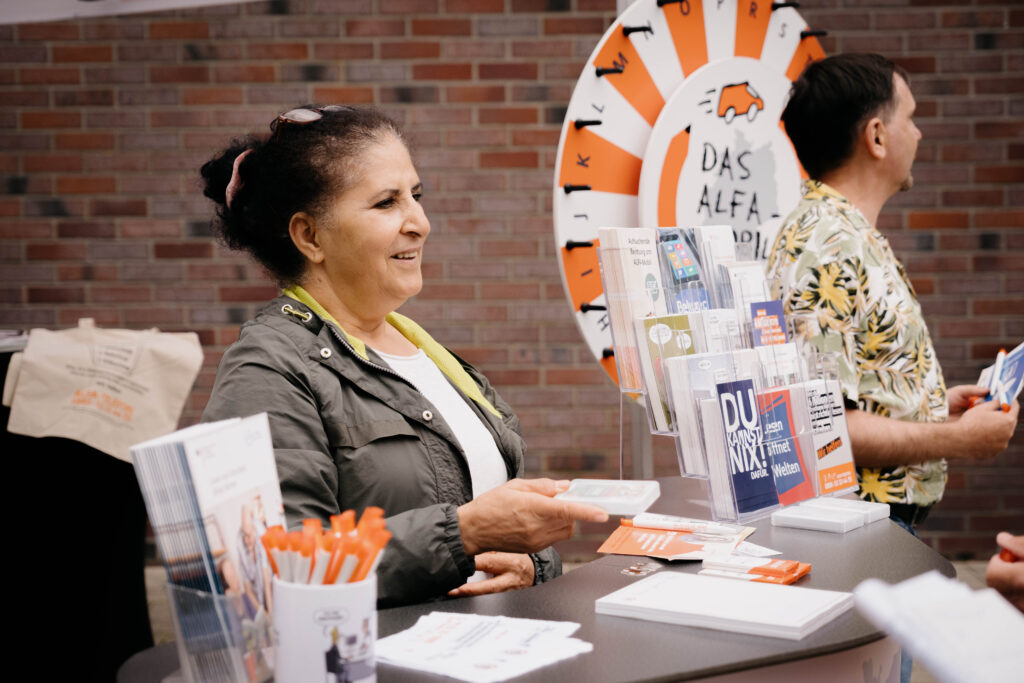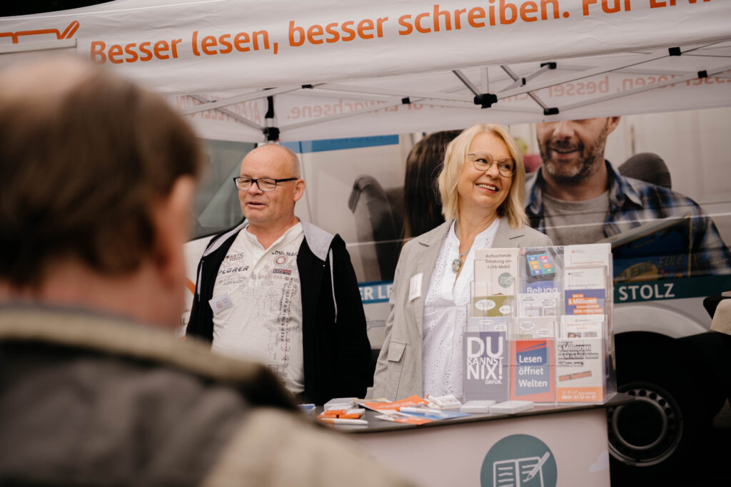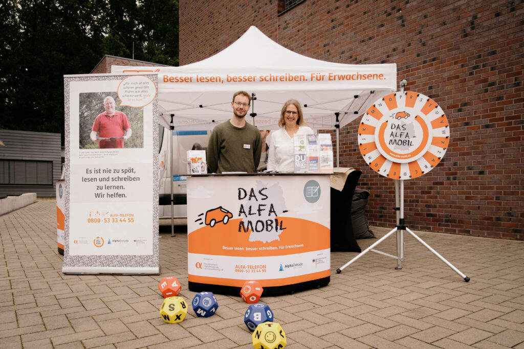 Das ALFA-Mobil ist deutschlandweit unterwegs und bietet Informationsstände vor Ort, um gemeinsam mit Kooperationspartnern vor Ort und ehemaligen Betroffenen über geringe Literalität aufzuklären.